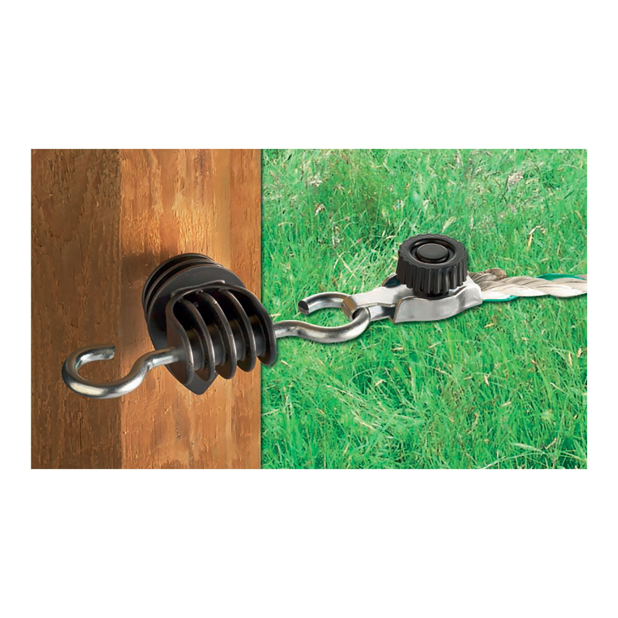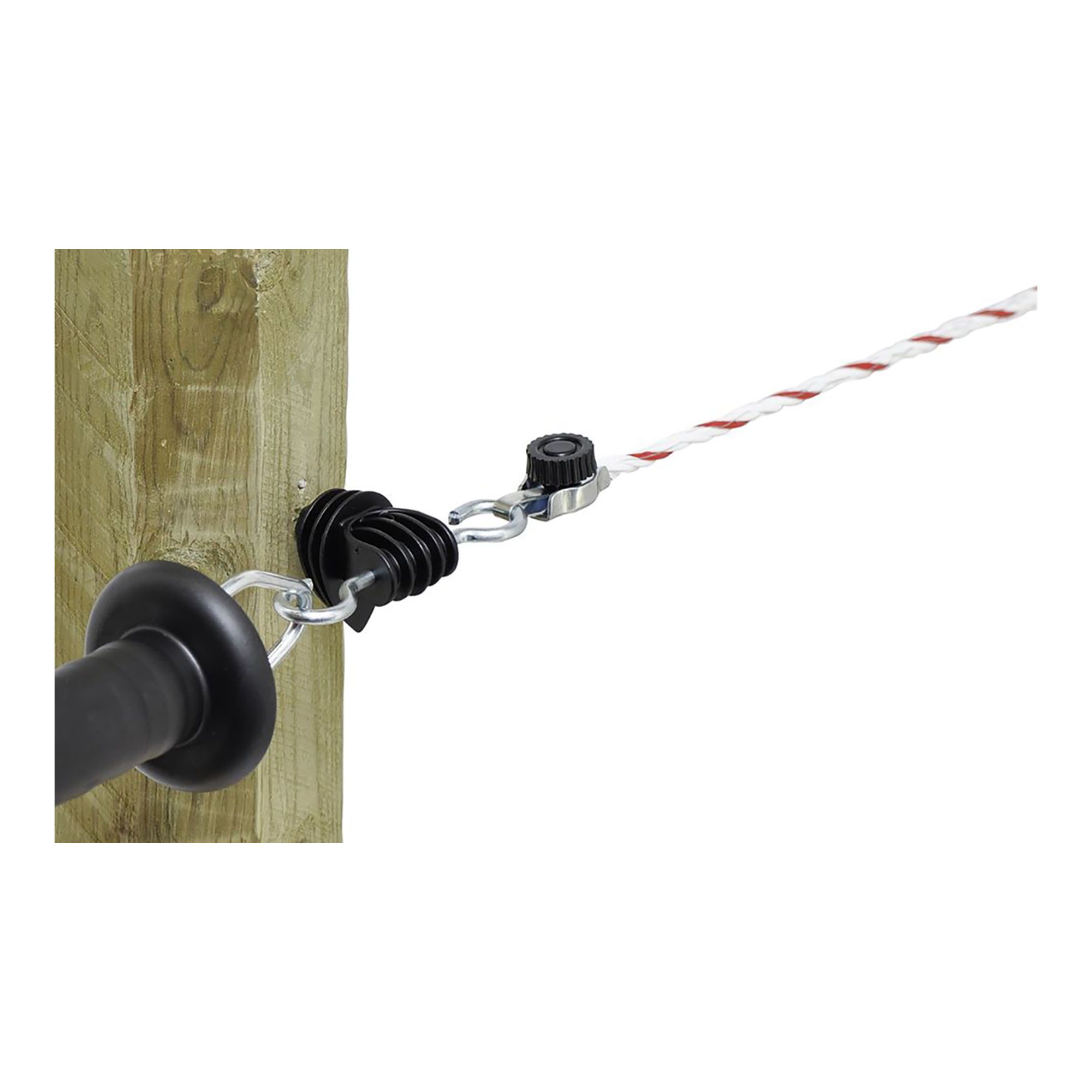 Quick connector for polywire and rope, allows ropes, wires and tapes of up to 10 mm to be connected to gate insulators and handles quickly and easily, resulting in a connection with optimal electrical conductivity, no tools required.