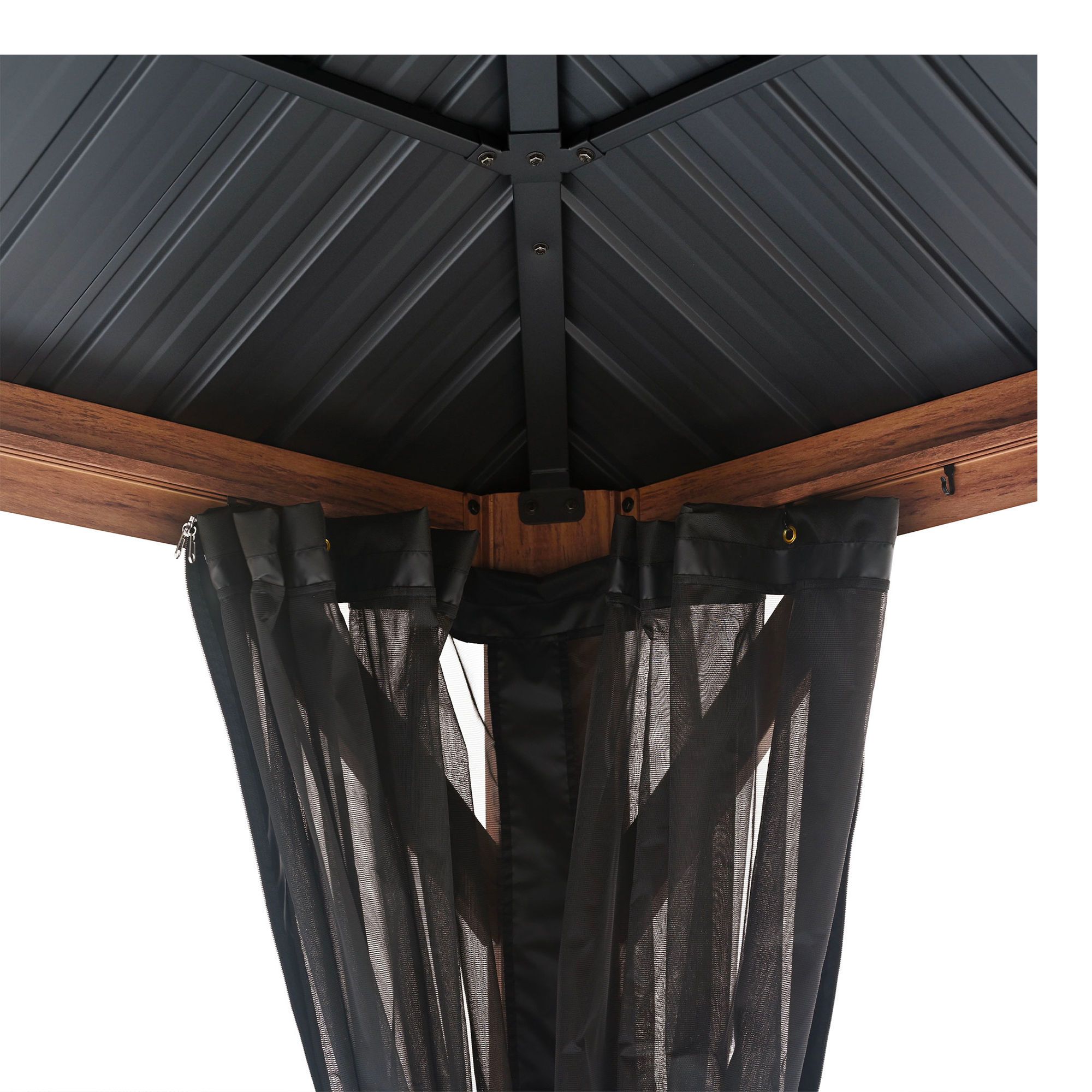 This 10 ft x 12 ft aluminum gazebo features a wood powder-coated finish and a reinforced double roof made of 0.45 mm galvanized steel. The dual-layer design improves airflow and reduces heat buildup in warm weather. Includes high-quality mosquito netting for insect-free enjoyment. Durable aluminum construction resists corrosion and supports year-round outdoor use. Suitable for patios, decks, and backyard entertaining areas.