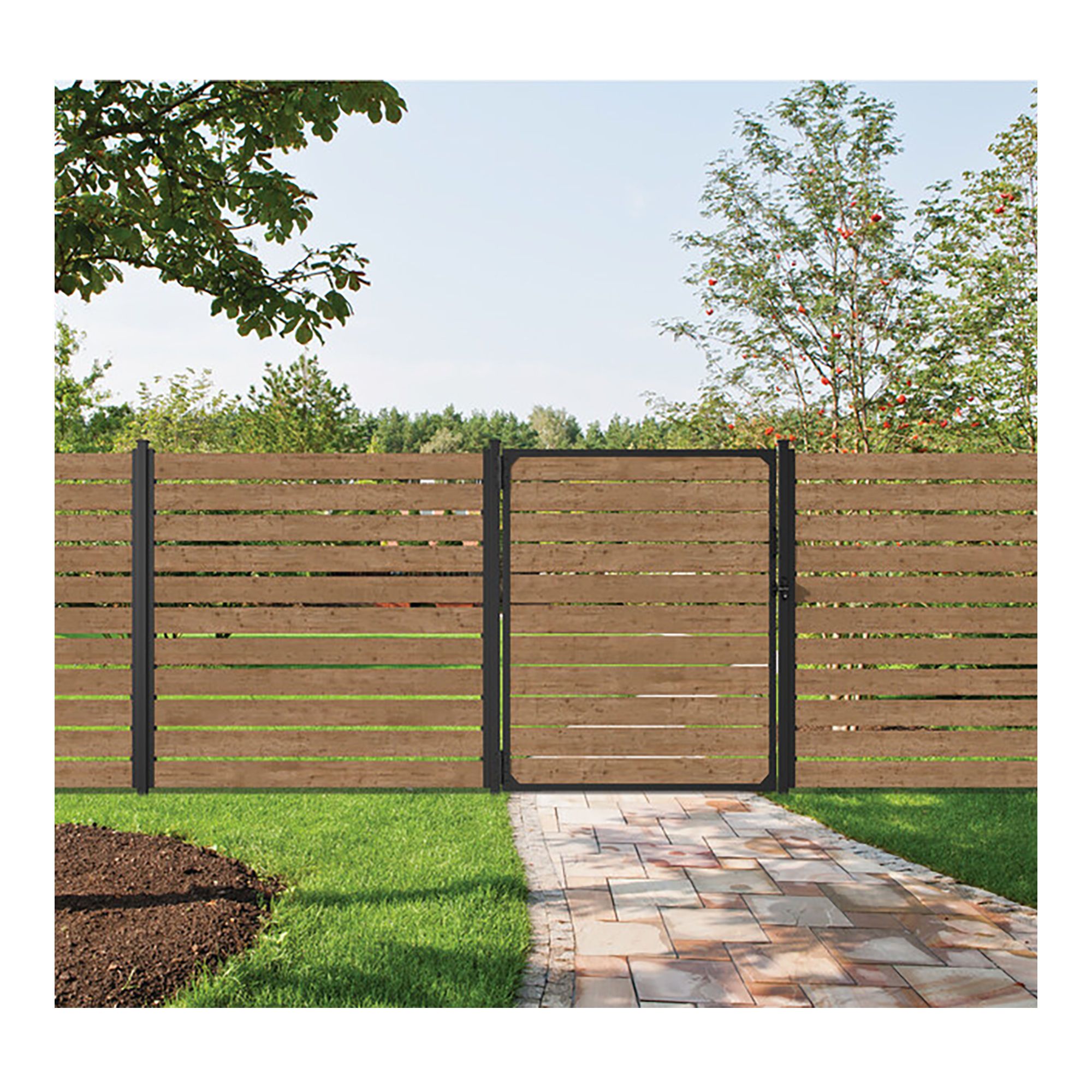 This fence frame set, measuring 58'' wide by 72'' tall, features a sturdy structure made of galvanized steel. It accommodates wood or composite boards up to 1'' (5/4'') thick, as well as Barrette Outdoor Living vinyl boards measuring 7/8'' thick by 72'' long (73047081). The matte black powder-coated finish adds a modern touch while ensuring exceptional durability. Seamless integration with Barrette Outdoor Living's 2''x2''x96'' steel post makes this frame ideal for in-ground installation (078-6322).