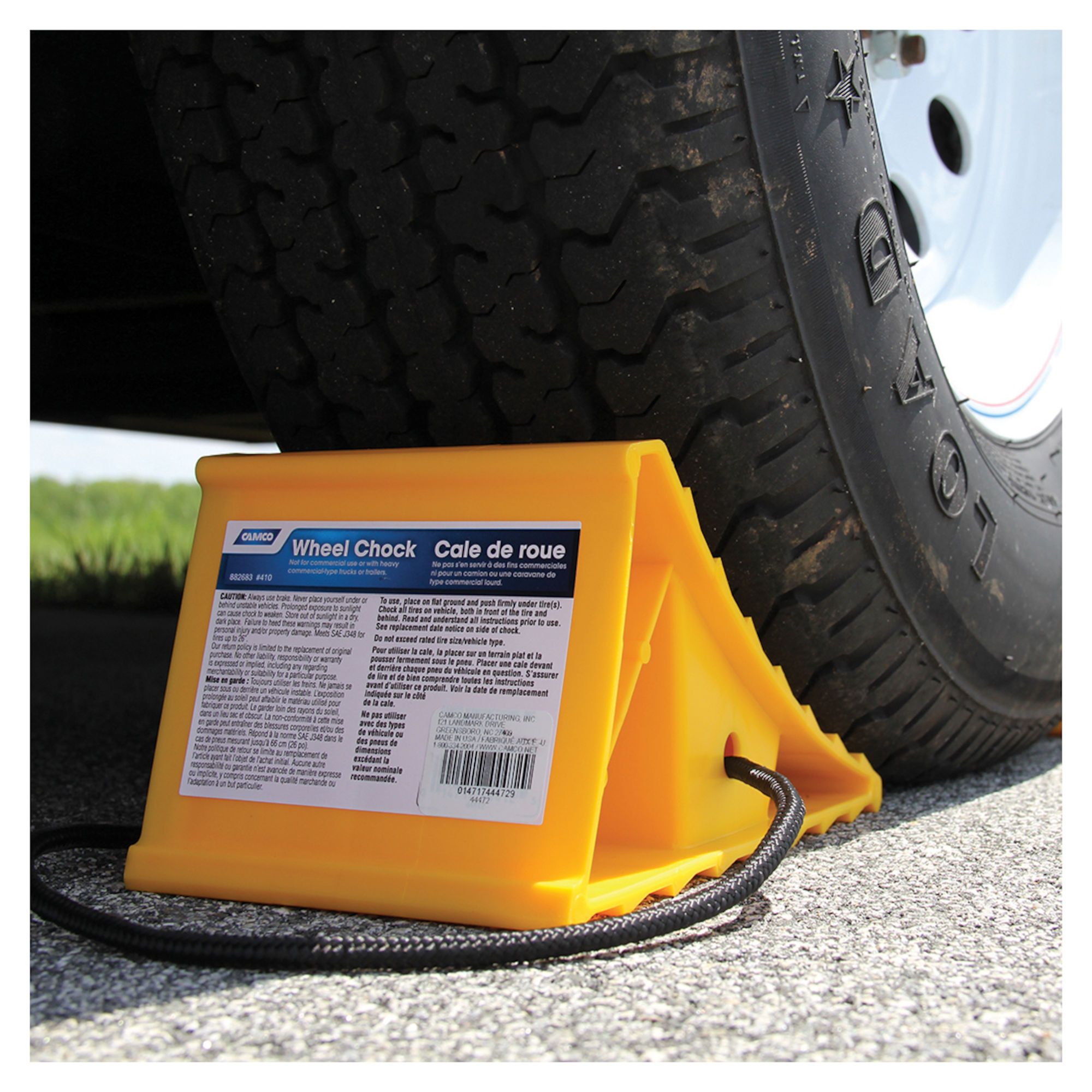 RV wheel chock with rope.