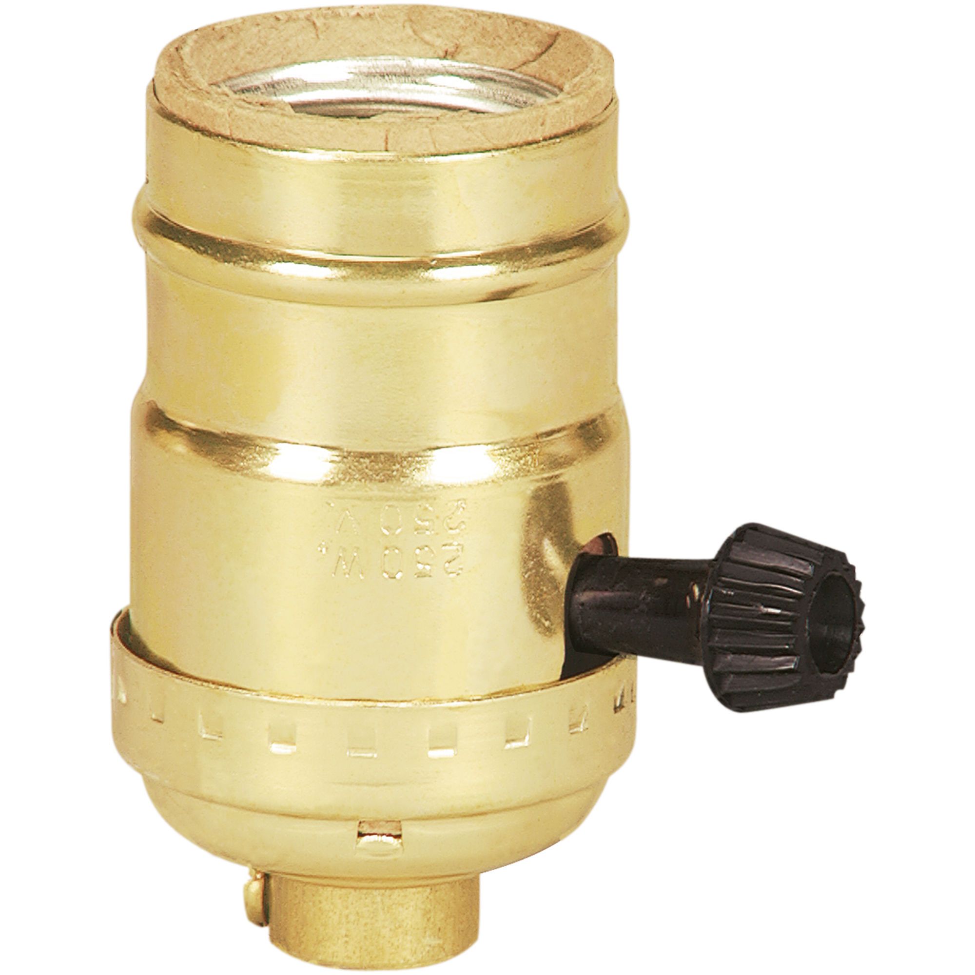 Lamp socket with bottom turn know switch, 250 W, 250 V, brass finish, medium base, phenolic.