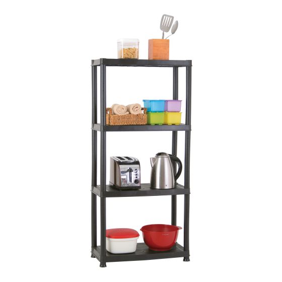 This 4-tier 12" shelf easily adds extra storage space in the laundry room, pantry, or garage. Made of resin, it resists rust, dents, stains, and peeling, preserving its appearance. Each shelf can support up to 55 lb (25 kg), maximizing your space.