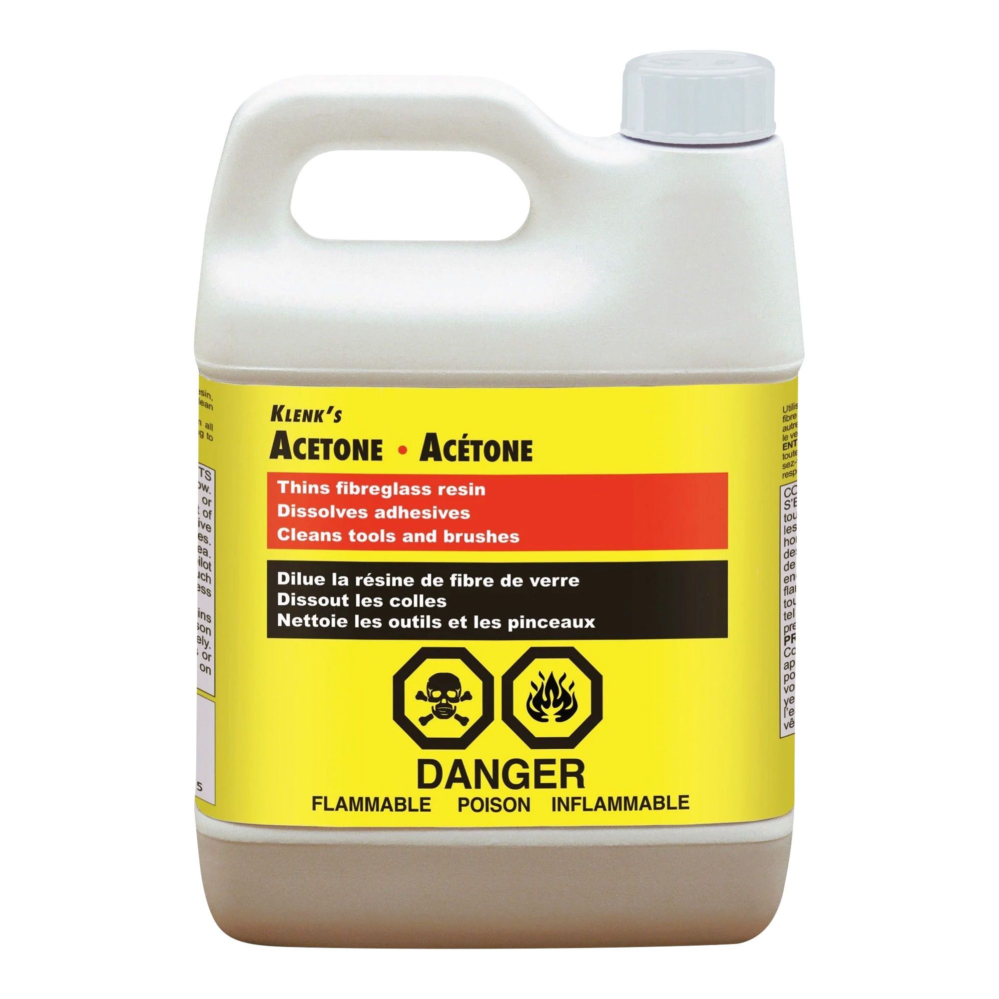 Klenk's Acetone thins fibreglass resins. It dissolve adhesives and cleans tools and brushes.