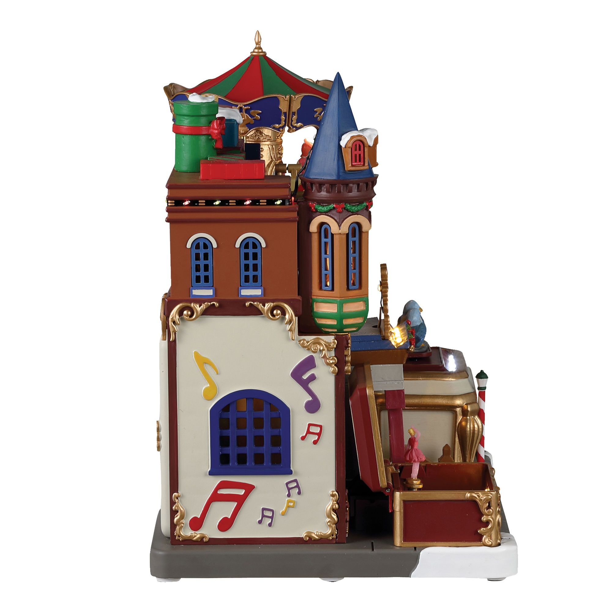 Let yourself be carried away by the magical melodies of "The Joyful Music Box" from the Caddington Village collection. This charming piece blends the enchantment of a festive carousel with the timeless allure of a music box. Admire the finely crafted figurines gracefully twirling to the rhythm of classic holiday tunes, creating a whimsical scene that will enchant both children and adults. Adapter included.