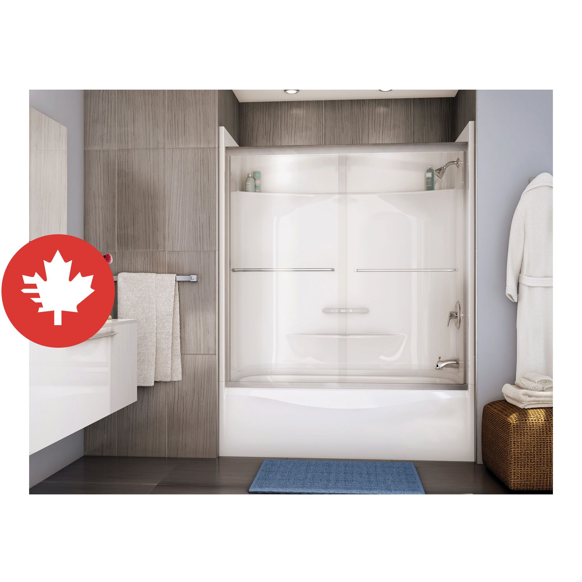 • Features: Large top corner shelves, a soap dish and a standard acrylic handle