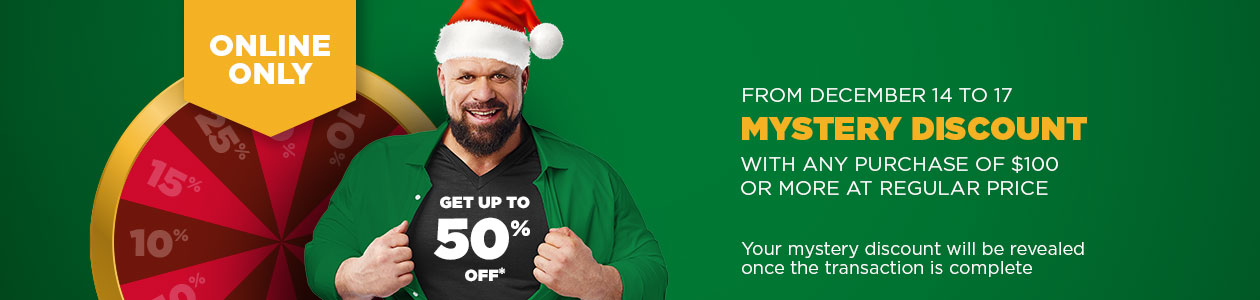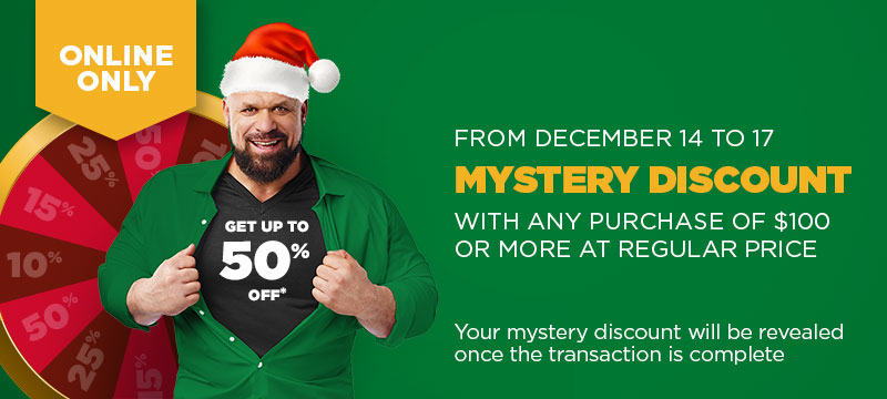 CONTEST RULES: The contest is open for residents of legal age in the provinces of Quebec, Ontario, New Brunswick, Prince Edward Island and Nova Scotia. The contest begins December 14, 2023, at 12:00 a.m. EDT and ends December 17, 2023, at 11:59 p.m. EDT. One (1) Mystery-discount per customer, per transaction, per day. All participants must correctly answer a mathematical skill-testing question before claiming a prize. Odds of winning: 50% off: 1%, 25% off: 2%, 15% off: 22%, 10% off: 75%.