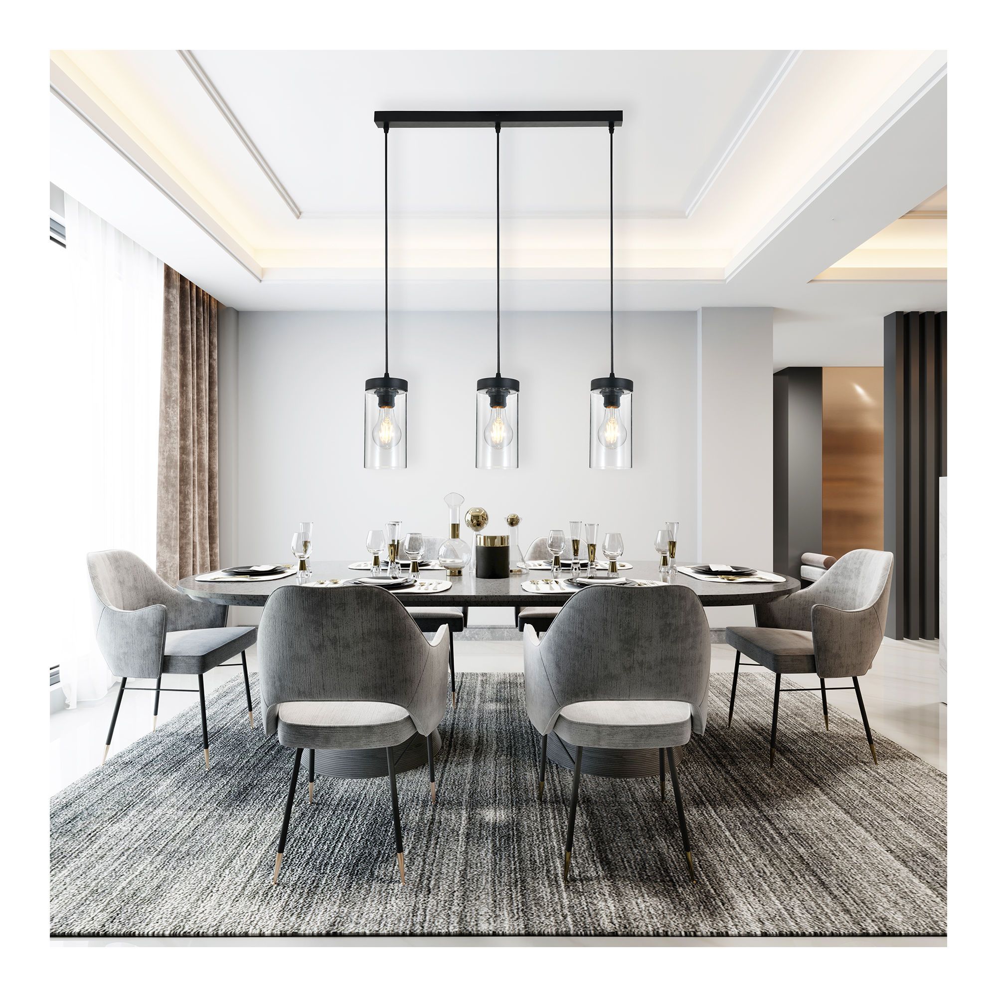 This three-light pendant combines the clarity of glass with sleek black accents to create a warm, welcoming ambiance. Each clear glass cylinder showcases the bulb inside, enhancing the overall light effect—especially with filament-style bulbs. Ideal over a kitchen island, dining table, or even a staircase landing, its clean and timeless design works effortlessly in both classic and modern interiors.