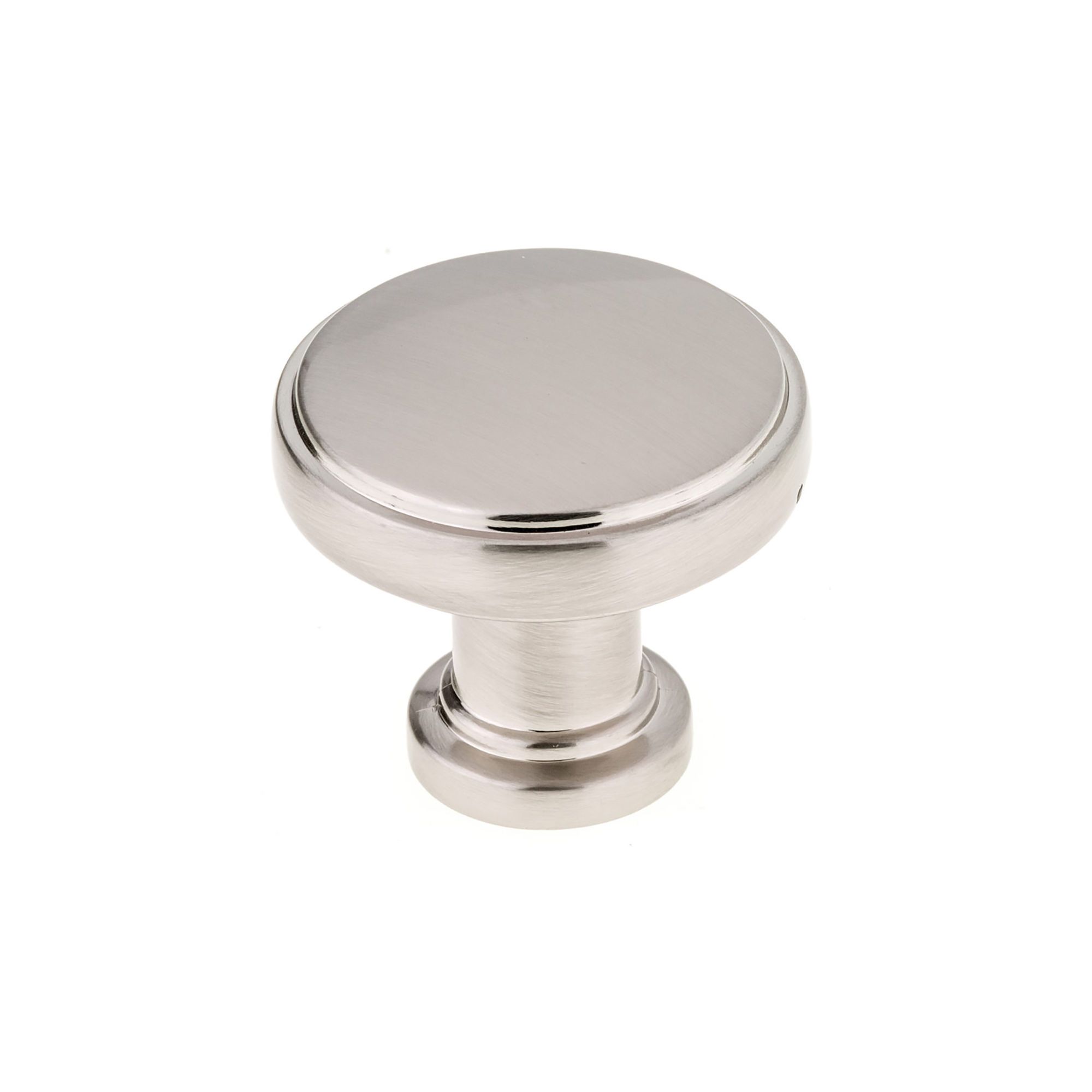 The smooth surface of this modern knob with a slightly elevated center is complemented by a stepped base to create a unique and refined design.