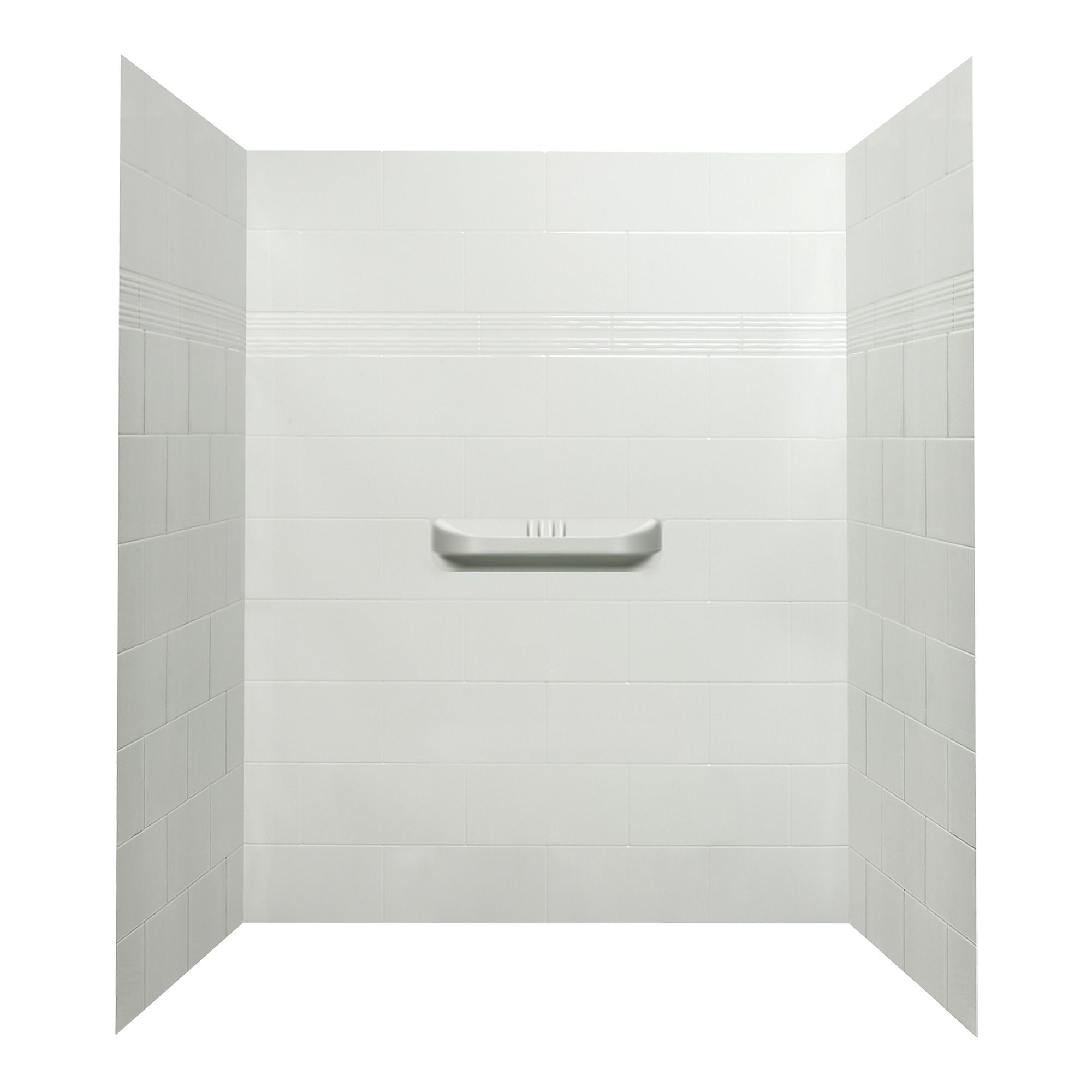 This 3-piece shower wall is made of acrylic with the appearance of ceramic tiles and features an integrated centre shelf.