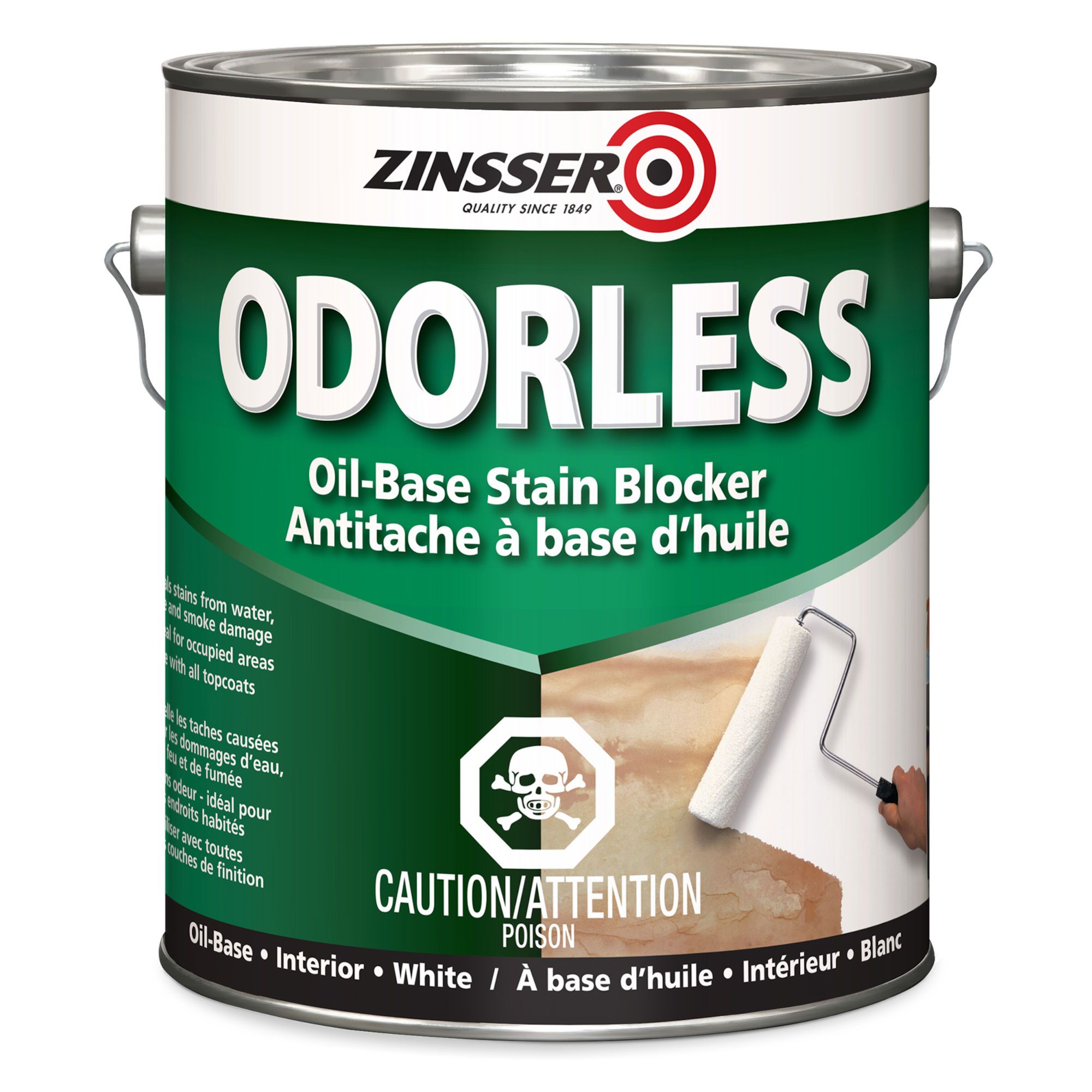 Bulls Eye all-purpose interior primer/sealer and ceiling finish, odorless, oil base.