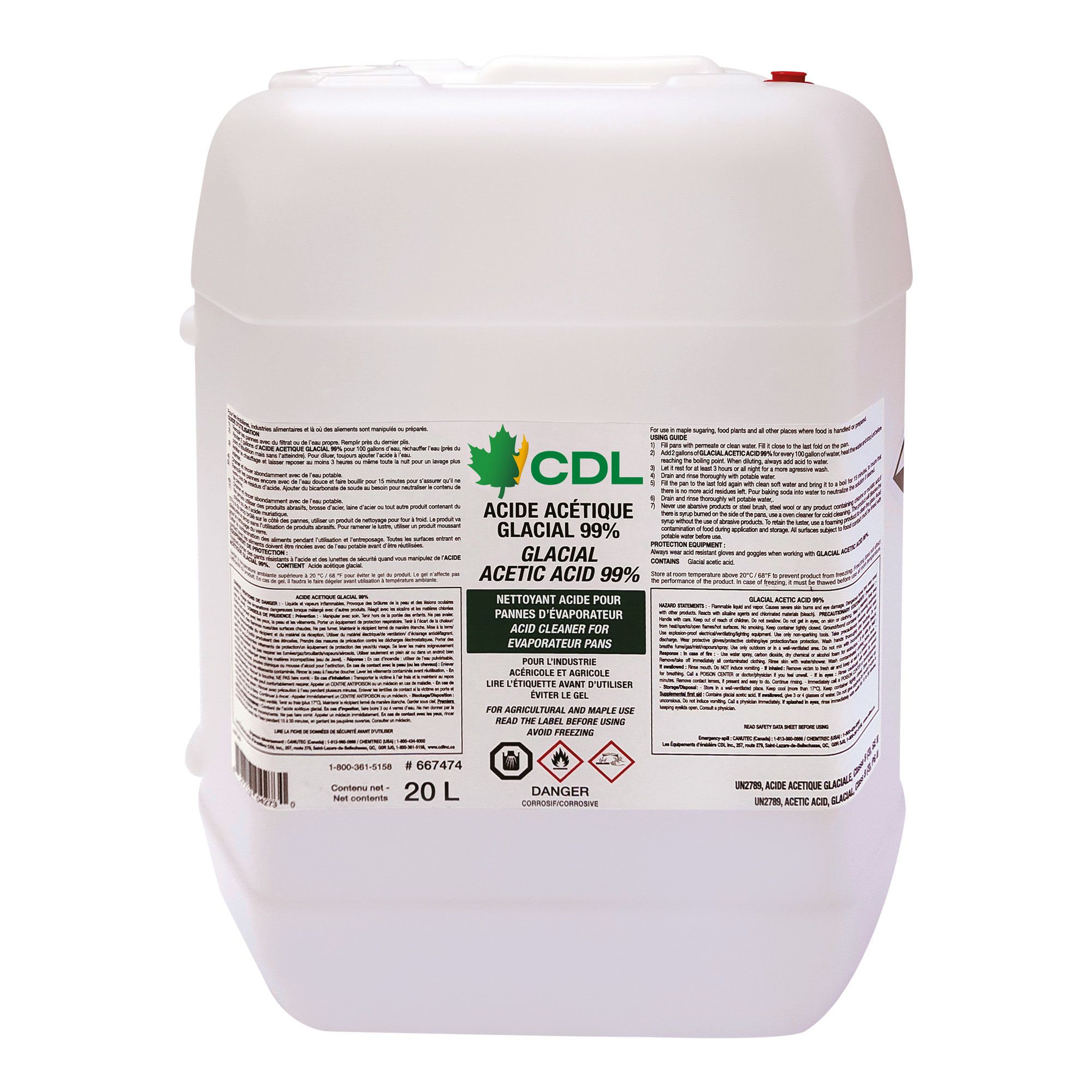 L'acide acétique peut être utilisé pour le nettoyage des pannes à sucre ainsi que pour l'acidification de l'eau d'abreuvement. L'acide acétique 56% a un point de congélation de -25 degrés C alors que l'acide acétique glacial 99% gèle à 18 degrés C. Recette de mélange pour les produits : 059-8347 et 059-8374 = 4.0 à 8.0 litres pour 100 litres d'eau. Pour le produit 059-8356 = 2.3 à 4.6 litres pour 100 litres d'eau.