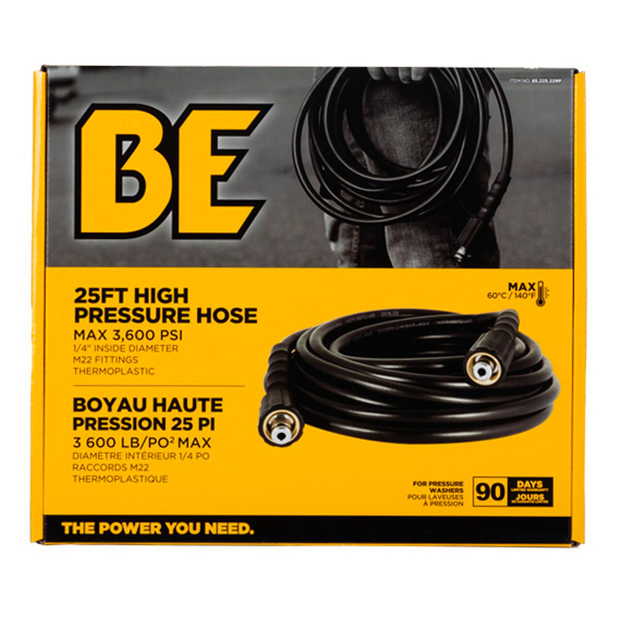 Ce boyau haute pression de 25 pi supporte jusqu’à 3600 PSI. Compatible avec la plupart des laveuses à pression grâce à son diamètre intérieur de 1/4" et ses raccords M22, il peut être utilisé seul ou connecté à un autre boyau pour étendre la portée de nettoyage sans déplacer l’équipement. Fabriqué en thermoplastique durable, il résiste à une température maximale de 60 °C, tout en assurant une performance constante pour nettoyer allées, clôtures ou revêtement extérieur.