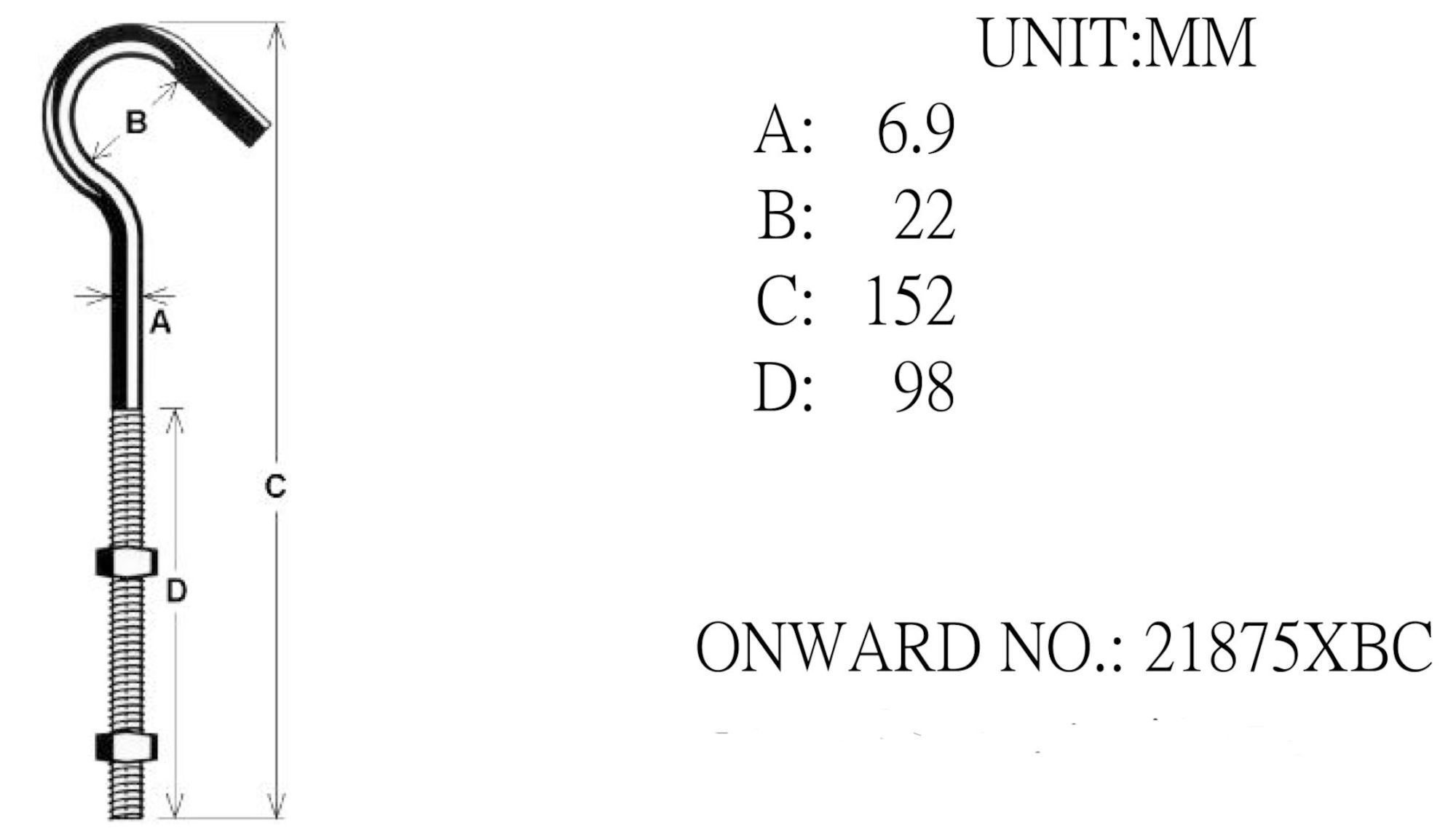Crochet polyvalent à tige allongée pouvant traverser un poteau et être fixé à l'aide d'un écrou de chaque côté.