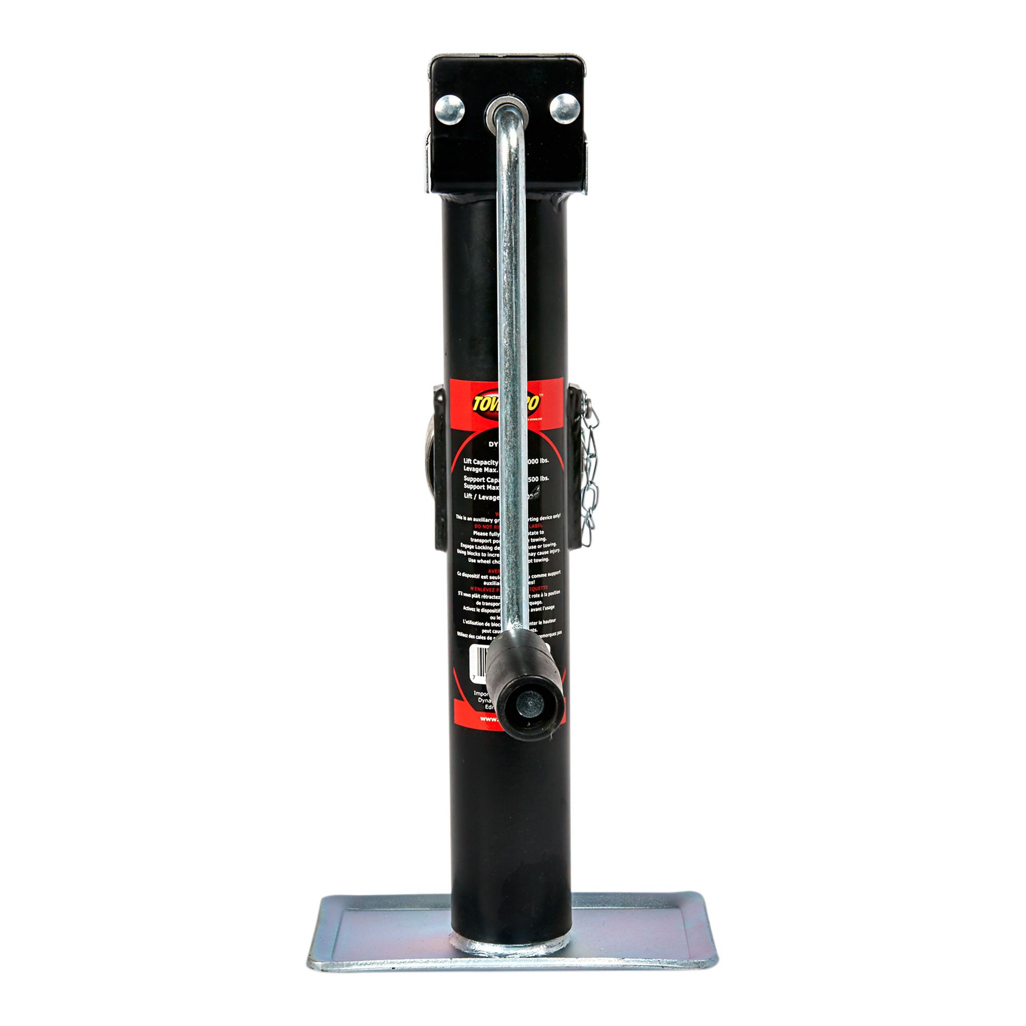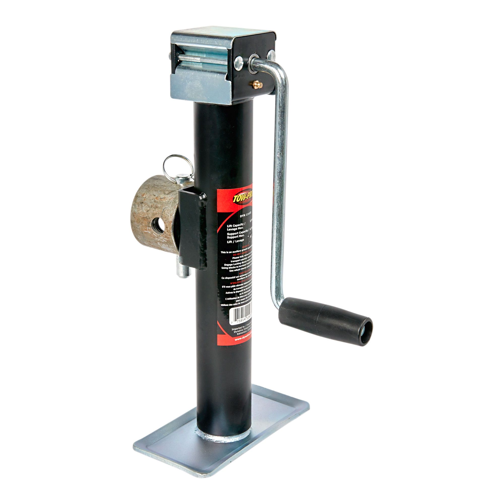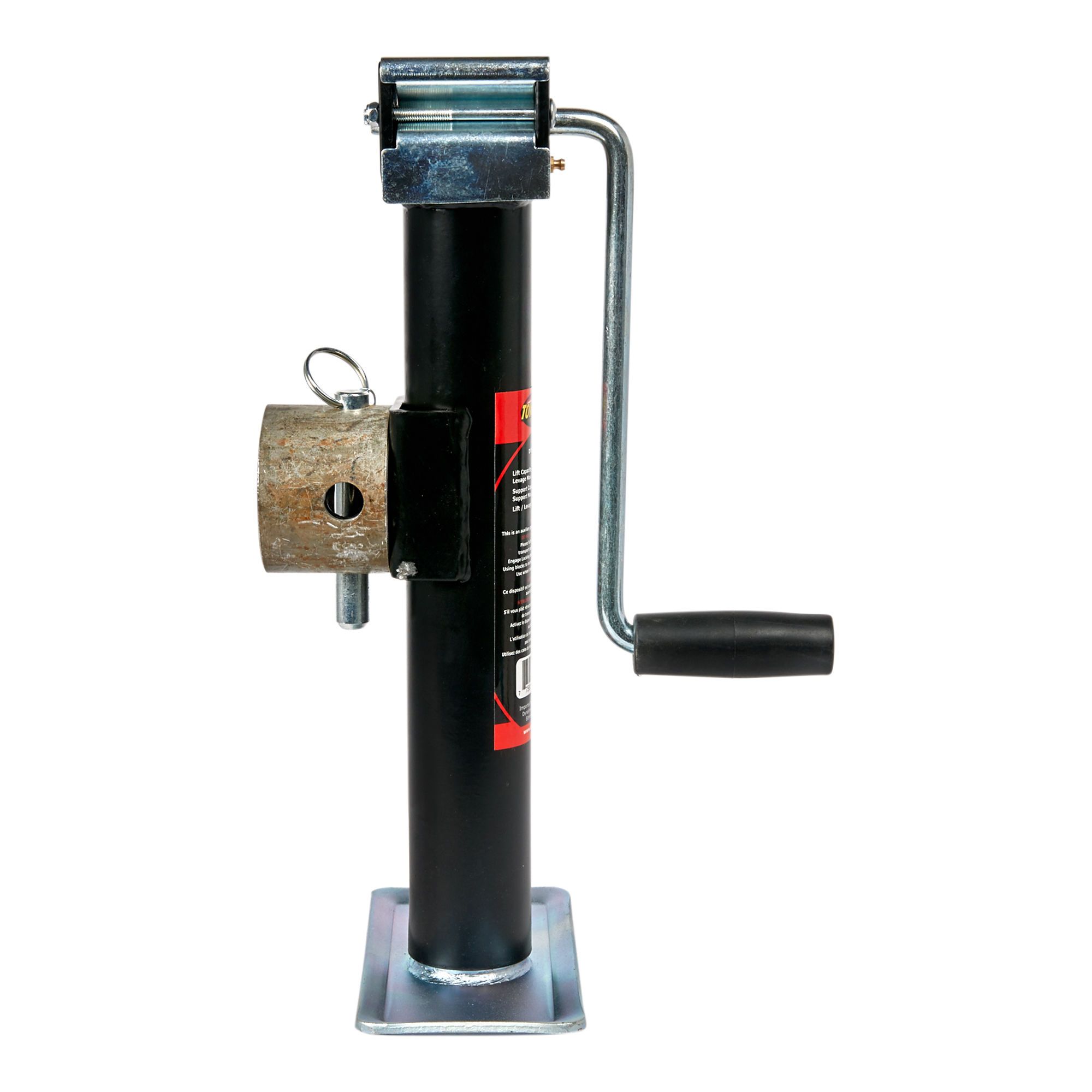 Le cric en tube rond a quatre positions de remontée du tube, goupille d'arrêt, manche, base plate 7 1/2 x 4 po et levier sur le côté.
