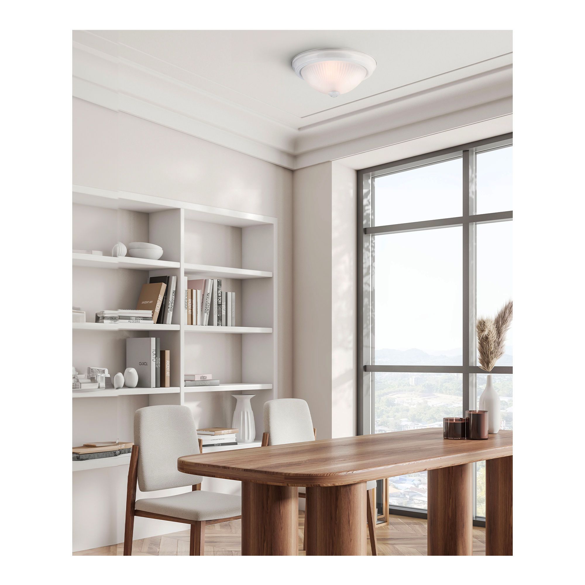 Avec son design discret et sa finition blanche, ce plafonnier s’intègre facilement dans n’importe quelle pièce. Son diffuseur en verre givré adoucit la lumière et limite l’éblouissement, tout en offrant un éclairage homogène. Il fonctionne avec deux ampoules A19 (non incluses) et se monte aisément au plafond, que ce soit dans un couloir, une chambre ou un espace utilitaire. Aussi sobre que polyvalent, il s’adapte aux besoins pratiques du quotidien sans surcharger visuellement l’environnement.