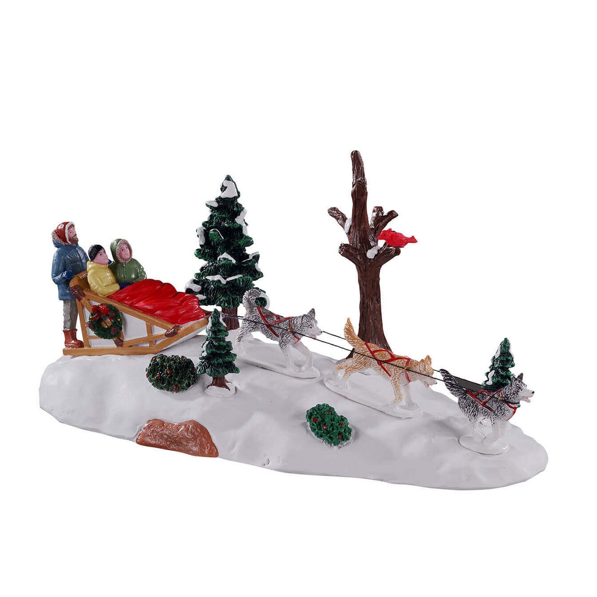 Quoi de mieux qu'un après-midi de traîneau à chiens ? Cette famille de trois personnes a décidé de sortir faire un tour avant qu'il ne fasse noir. Trois beaux huskies sont attachés au traîneau et tirent joyeusement le traîneau à travers la forêt enneigée. Maman et son jeune enfant sont assis dans le traîneau, recouverts d'une grande couverture pendant que le conducteur est debout et guide les chiens.