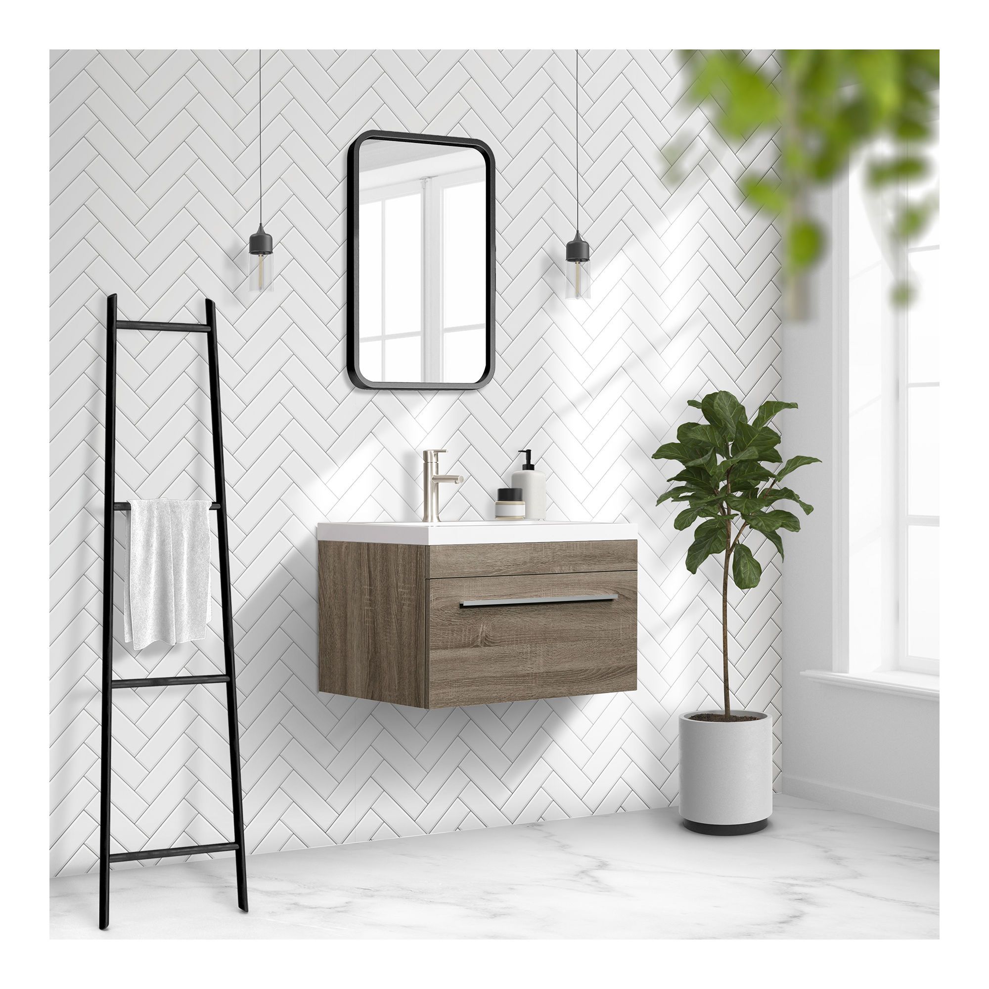 • Meuble-lavabo à montage mural en mélamine, doté d'un tiroir à fermeture amortie