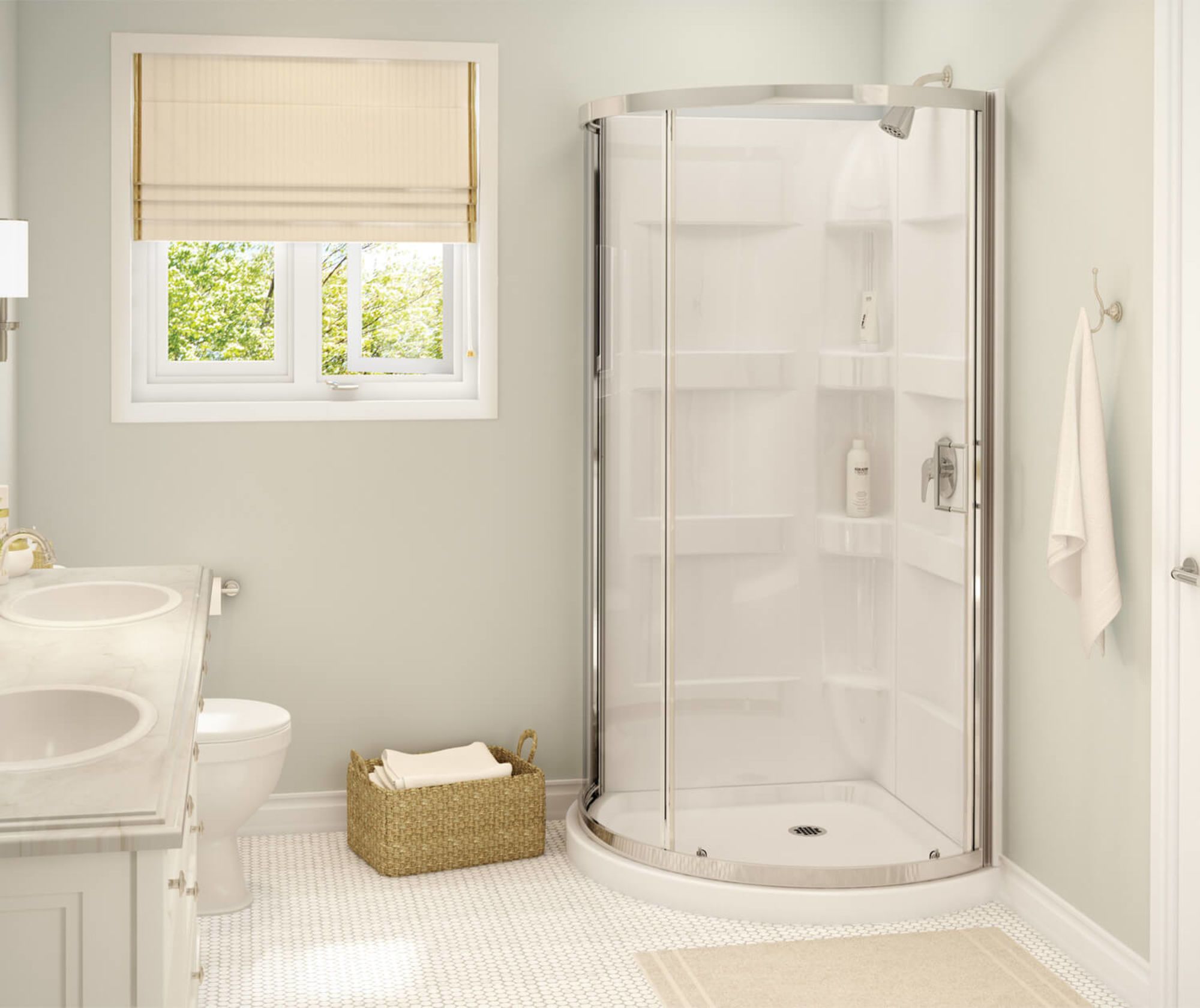 Douche ronde en coin, Charlotte, 34" x 34" x 76", blanc et chrome