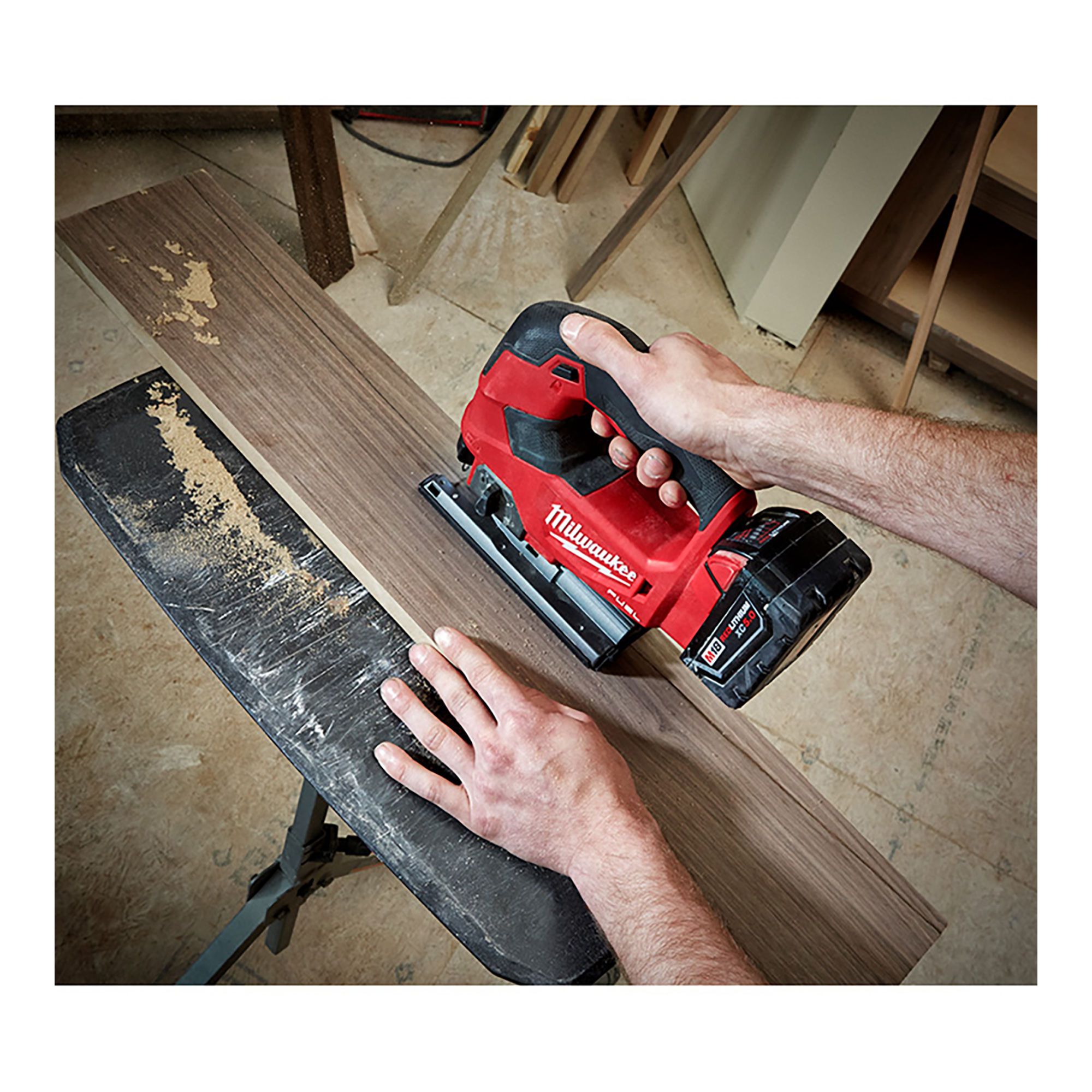 La scie sauteuse M18 FUEL avec poignée en D allie la puissance, la vitesse de lame et la précision pour fournir des coupes de la plus haute qualité dans une grande variété de matériaux. La scie sauteuse M18 FUEL avec poignée en D utilise le moteur sans balai POWERSTATE et la technologie intelligente REDLINK Plus pour fournir une vitesse de lame plus élevée que les scies sauteuses à fil à 3 500 coups par minute pour des coupes propres contrôlées avec un burinage ou un bouclage minimisé.