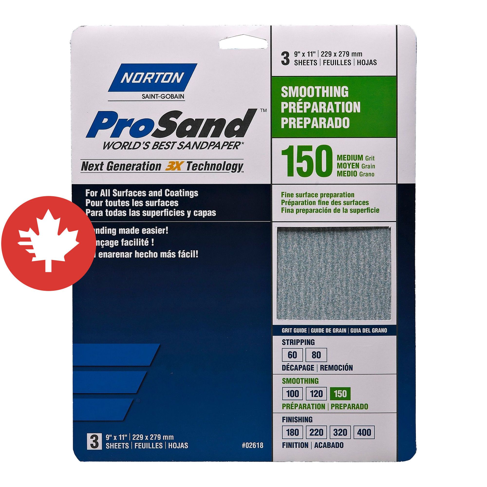 Papier de ponçage à Gr. fin Norton ProSand, 11" x 9", Gr. 150, 3/pqt
