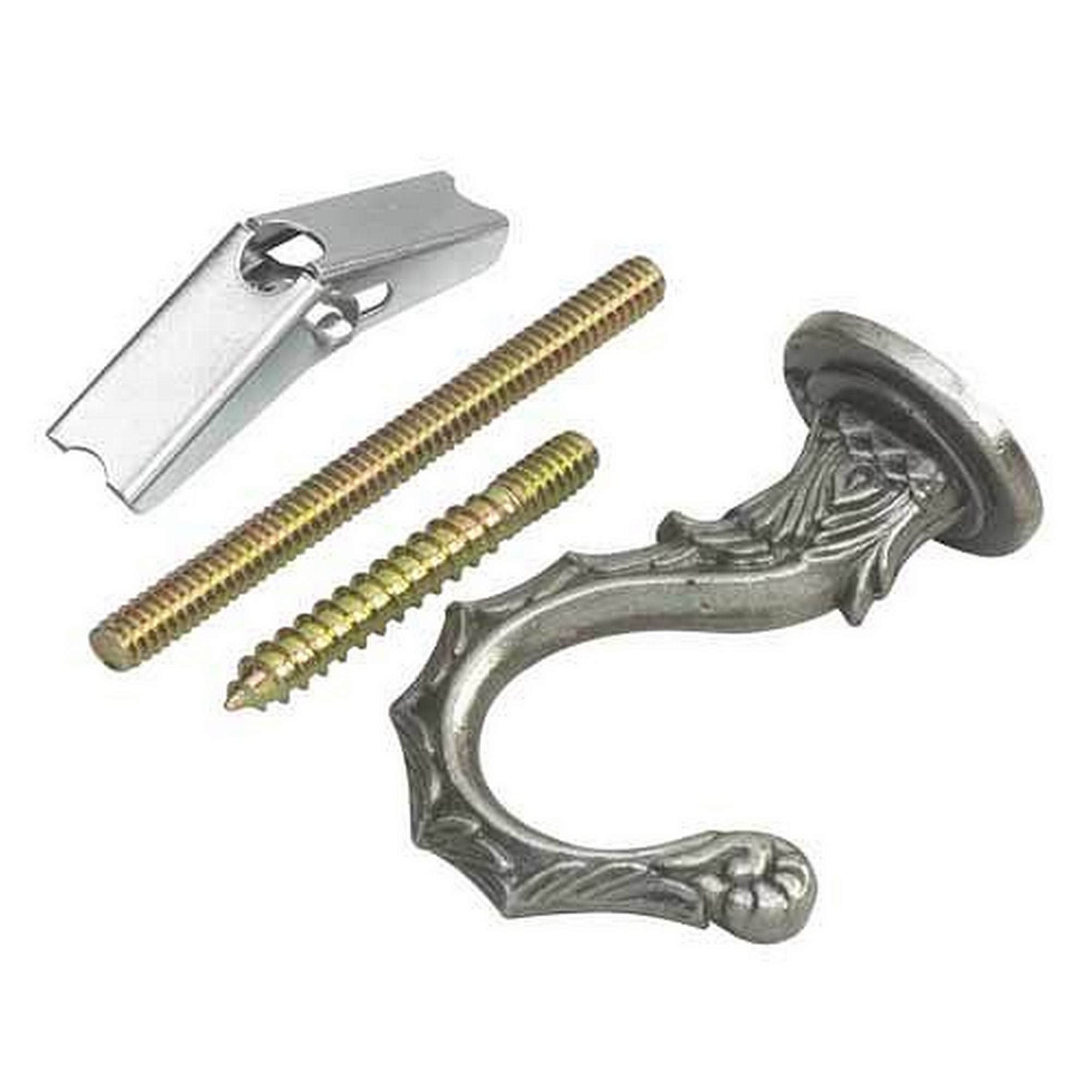 - Pour des plafonds creux: Assembler le boulon à ailette au crochet. Prépercer au plafond un trou de la même dimension que le boulon à ailettes lorsque celles-ci sont fermées. Serrer les ailettes et insérer complètement dans le plafond. Serrer en tournant le crochet.