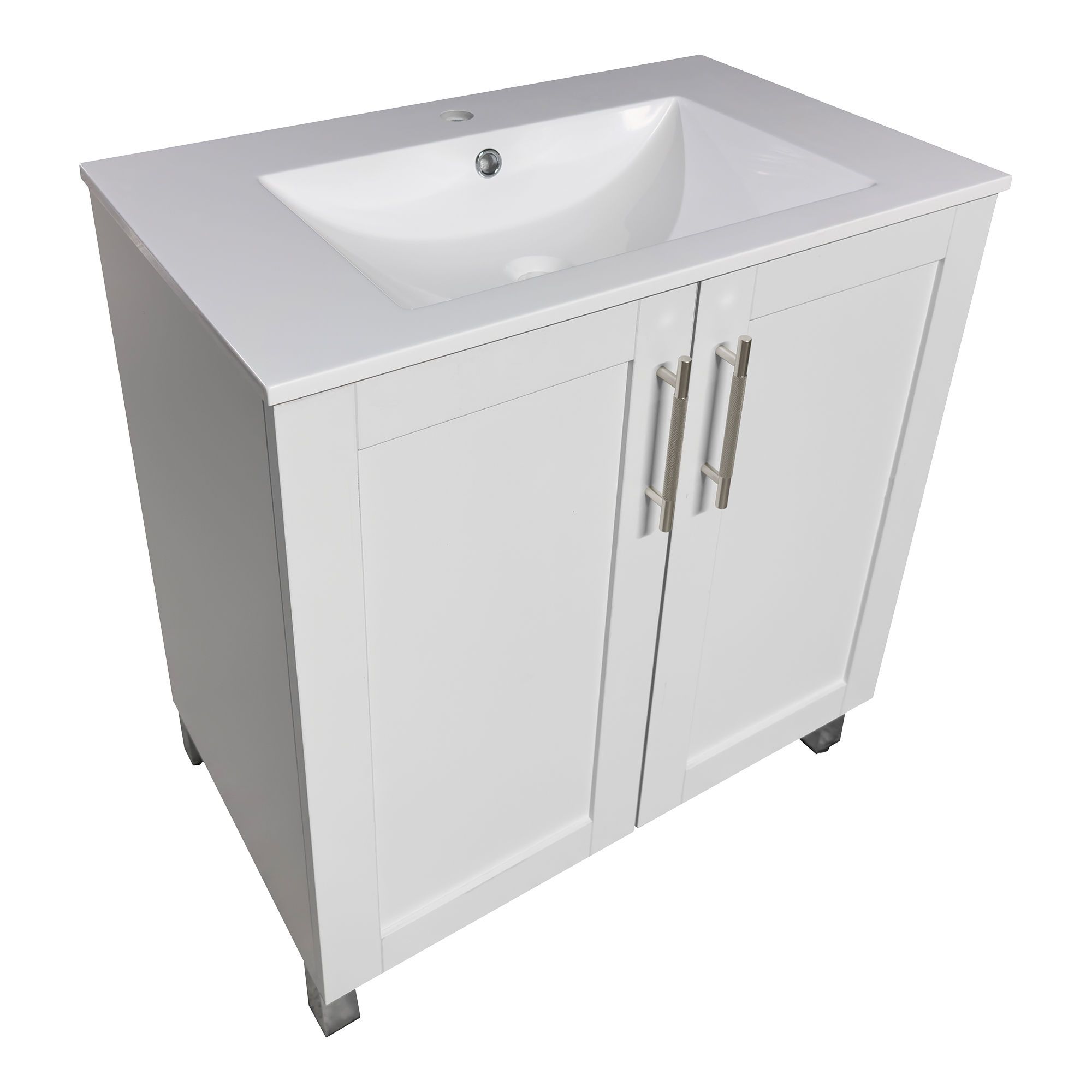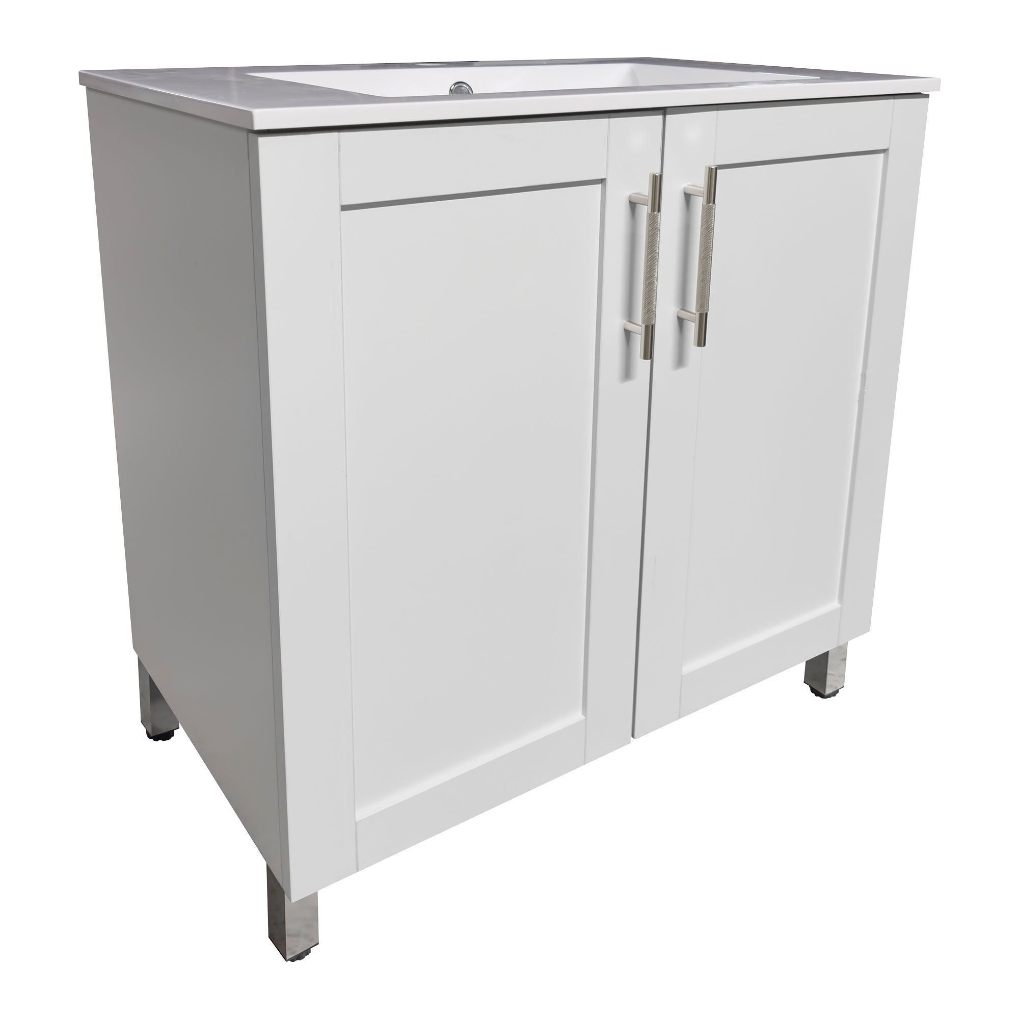 Le meuble-lavabo Lagoa de 30 po offre une solution pratique et facile à installer. Sa structure en mélamine blanche, rehaussée de deux portes de style Shaker à fermeture douce, assure un accès silencieux et immédiat au rangement intérieur. Les poignées et pattes en acier inoxydable ajoutent une touche de modernité tout en assurant une grande robustesse. Le comptoir monobloc en composite intègre quant à lui un bassin avec trop-plein et trou pré-percé, prêt à recevoir le robinet de votre choix. Prémonté, ce meuble s’installe rapidement, garantissant une finition soignée et professionnelle.
