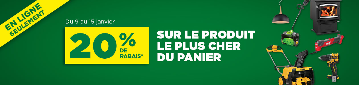 Cette promotion est en vigueur du 9 au 15 janvier 2025 en ligne seulement au BMR.ca. Recevez 20 % de rabais sur le produit le plus cher de votre panier d’achat. L’article doit être à prix régulier. Si votre panier contient plus d’une unité du même produit, le rabais s’appliquera à une seule unité. Le rabais sera appliqué dans votre panier d’achat, avant les taxes. Limite d’une transaction par adresse courriel sur toute la durée de la promotion. EXCLUSIONS : Certains matériaux de construction (Bois, panneaux à projets, bardeaux de cèdre, bois traité, composite, revêtements extérieurs, panneaux de gypse, laine et panneaux isolants, isolant cellulose, pare-air, coupe-vapeur, polyéthylène, toiture, panneaux de ciment, tuyaux BNQ, polyéthylène et SDR), les chauffe-eau, les produits acéricoles et de fenaison, les produits pour bâtiments agricoles (éclairage, ventilation, revêtement intérieur Trusscore, tapis et matelas de caoutchouc), les articles annoncés dans la circulaire ou déjà en rabais, les mises de côté, les articles en commande spéciale, les animaux, l’essence, le propane, les achats portés à un compte, les cartes-cadeaux, les services offerts en magasin tels que l’installation, la location, la livraison ainsi que le service de coupe ne sont pas admissibles. Seuls les achats payés par carte de crédit et par PayPal sont admissibles. L’offre ne s’applique pas aux achats antérieurs ou ultérieurs. L’offre est non monnayable et ne peut être combinée à aucune autre promotion. Applicable uniquement sur la marchandise en stock au bmr.ca au moment de la promotion. Non valable en magasin. BMR se réserve le droit d’annuler toute commande après en avoir avisé le client.
