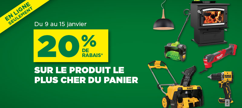 Profitez de 20 % de rabais sur le produit le plus cher de votre panier, qu’il s’agisse de chauffage, d’outils ou d’équipements hivernaux!