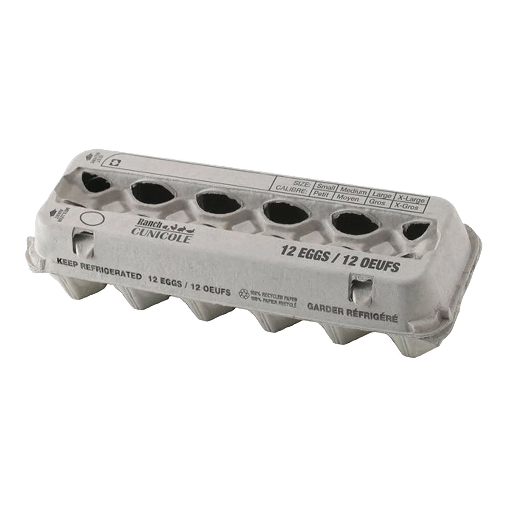 Cette boîte en carton peut contenir 12 œufs de calibre petit, moyen, gros ou extra-gros. Il suffit ensuite de cocher au crayon feutre le calibre des œufs contenus dans la boîte.