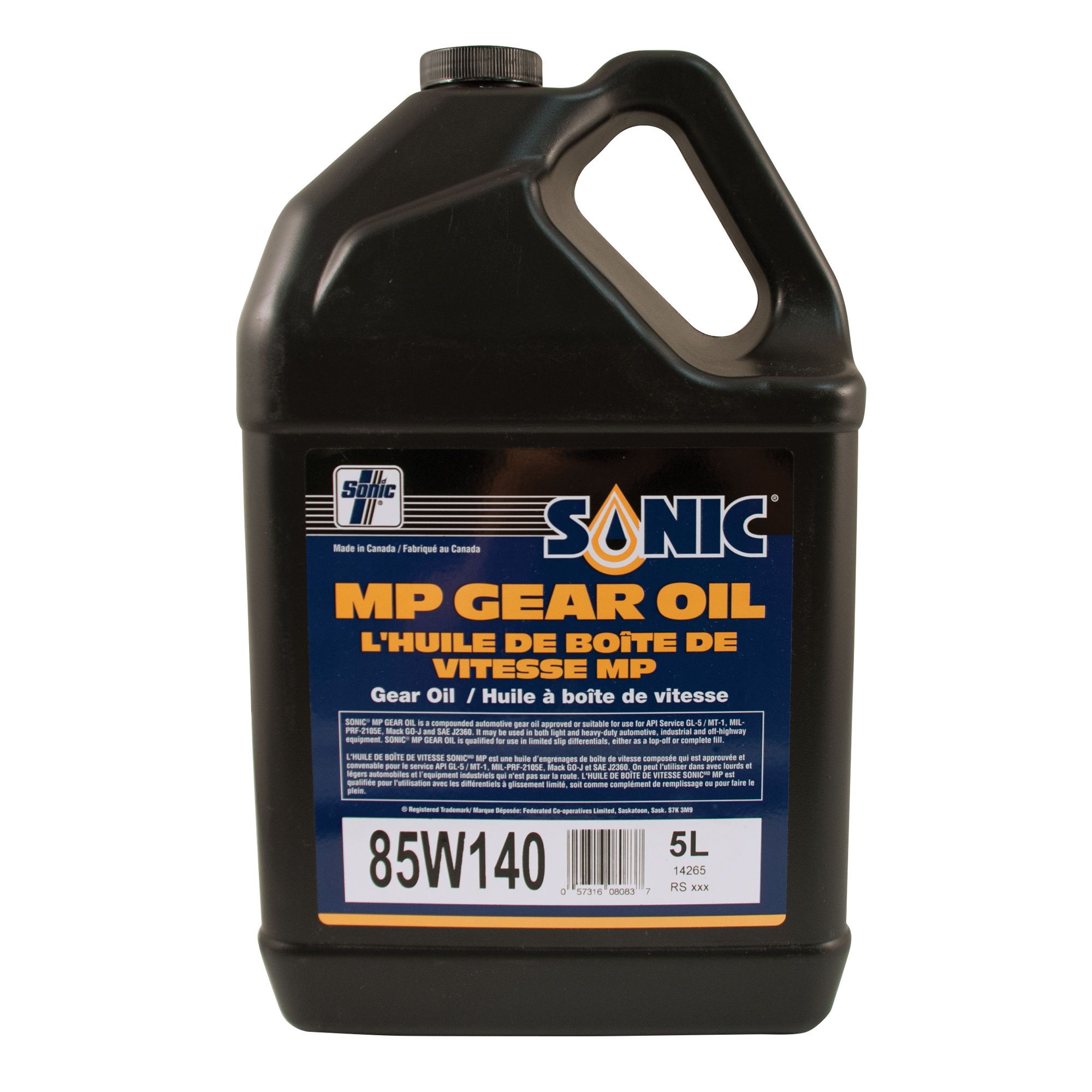 L'huile à engrenage SAE 85W140 SONIC MP répond aux spécifications suivantes : API: GL5, MACK GO-H, MIL-L-2105E, FORD, MT1, CGSB 3GP.