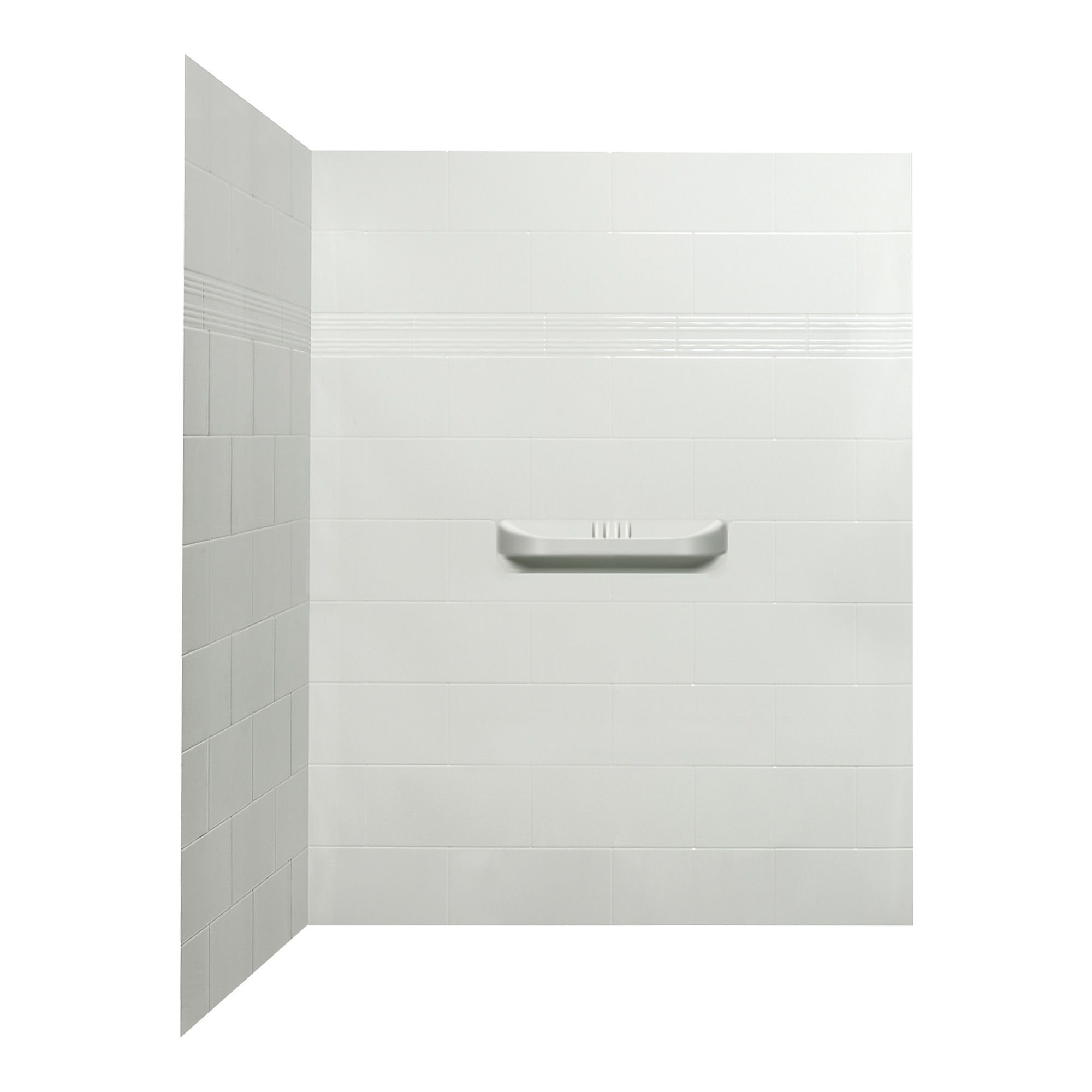 Ce mur de douche en 2 pièces est fait en acrylique avec l’apparence de carreaux de céramique et comporte une tablette centrale intégrée.