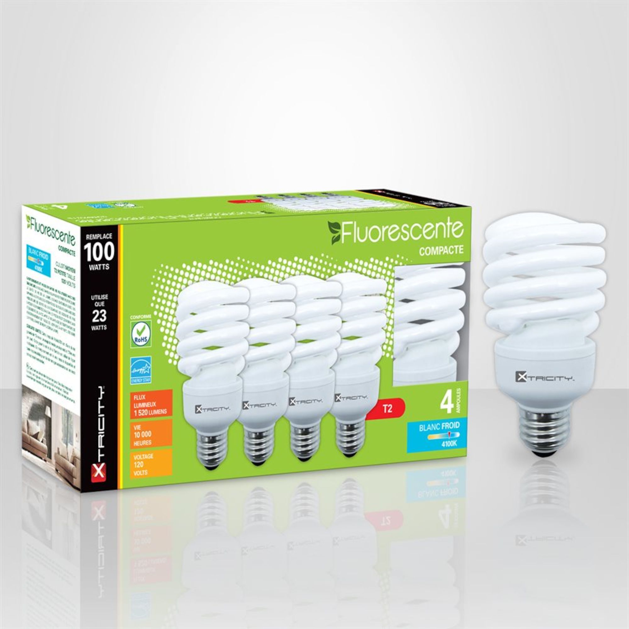Ampoule fluocompacte, T2 spirale, blanc froid, 23 W, 4/pqt