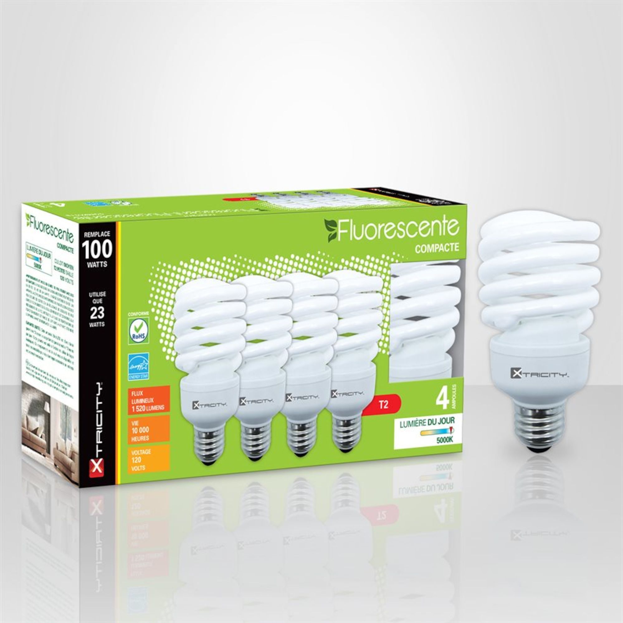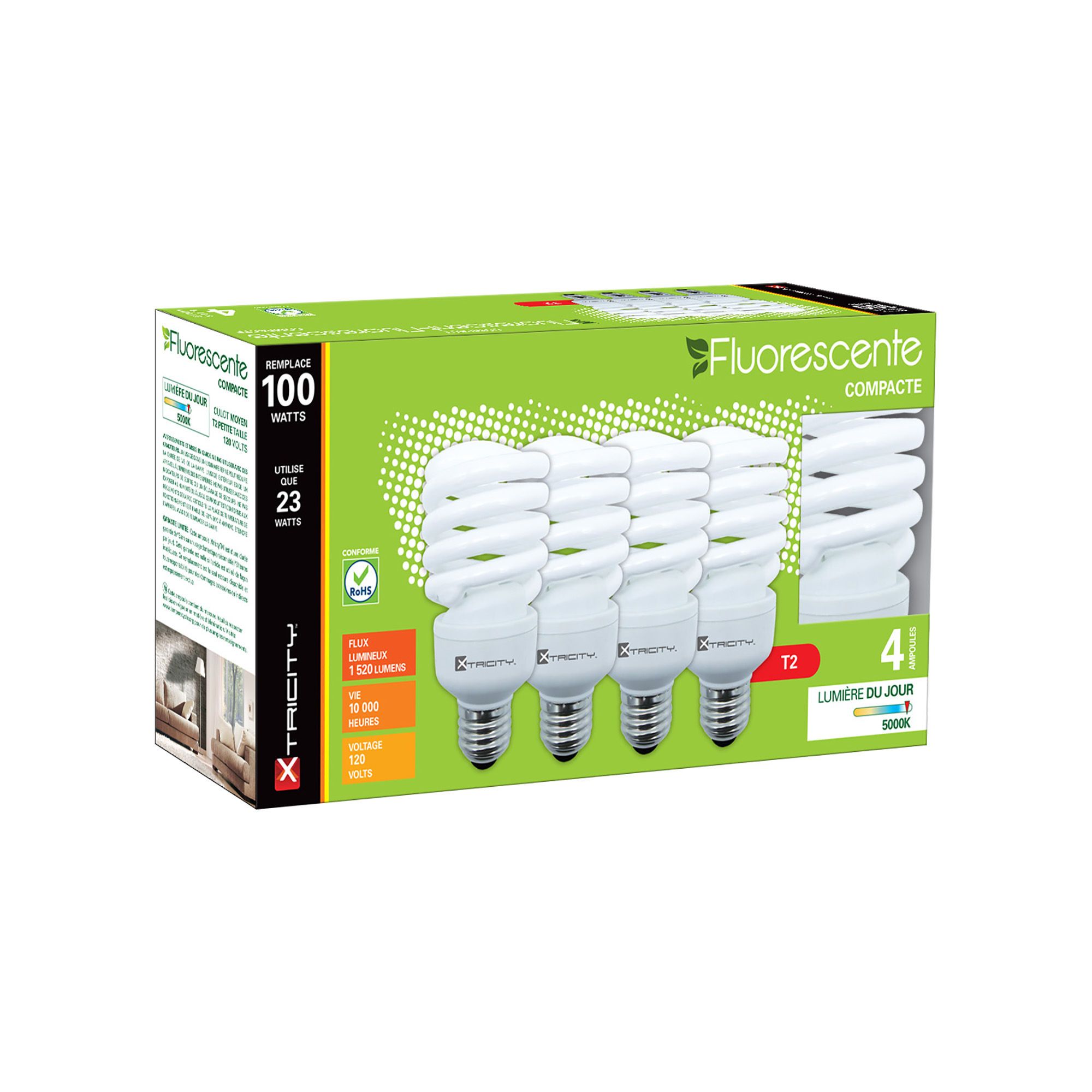 Ampoule fluocompacte, T2 spirale, lumière du jour, 23 W, 4/pqt